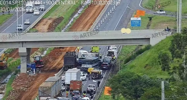 Vários veículos se envolveram em um acidente, o que causou um longo congestionamento na Rodovia Washington Luís (SP-310) em São José do Rio Preto (SP) na tarde desta segunda-feira (30). Um motociclista gravou imagens do congestionamento e dos carros acidentados.