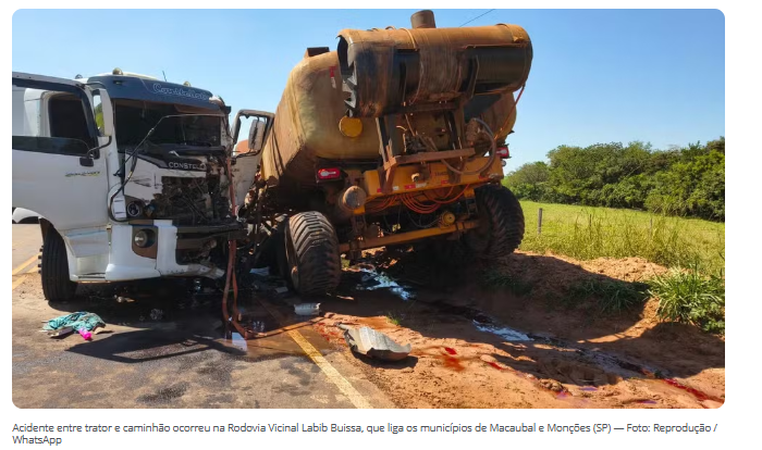 Um acidente entre um trator e um caminhão causou o vazamento de óleo diesel na Rodovia Vicinal Labib Buissa, que liga os municípios de Macaubal e Monções (SP), na manhã desta quinta-feira (23).