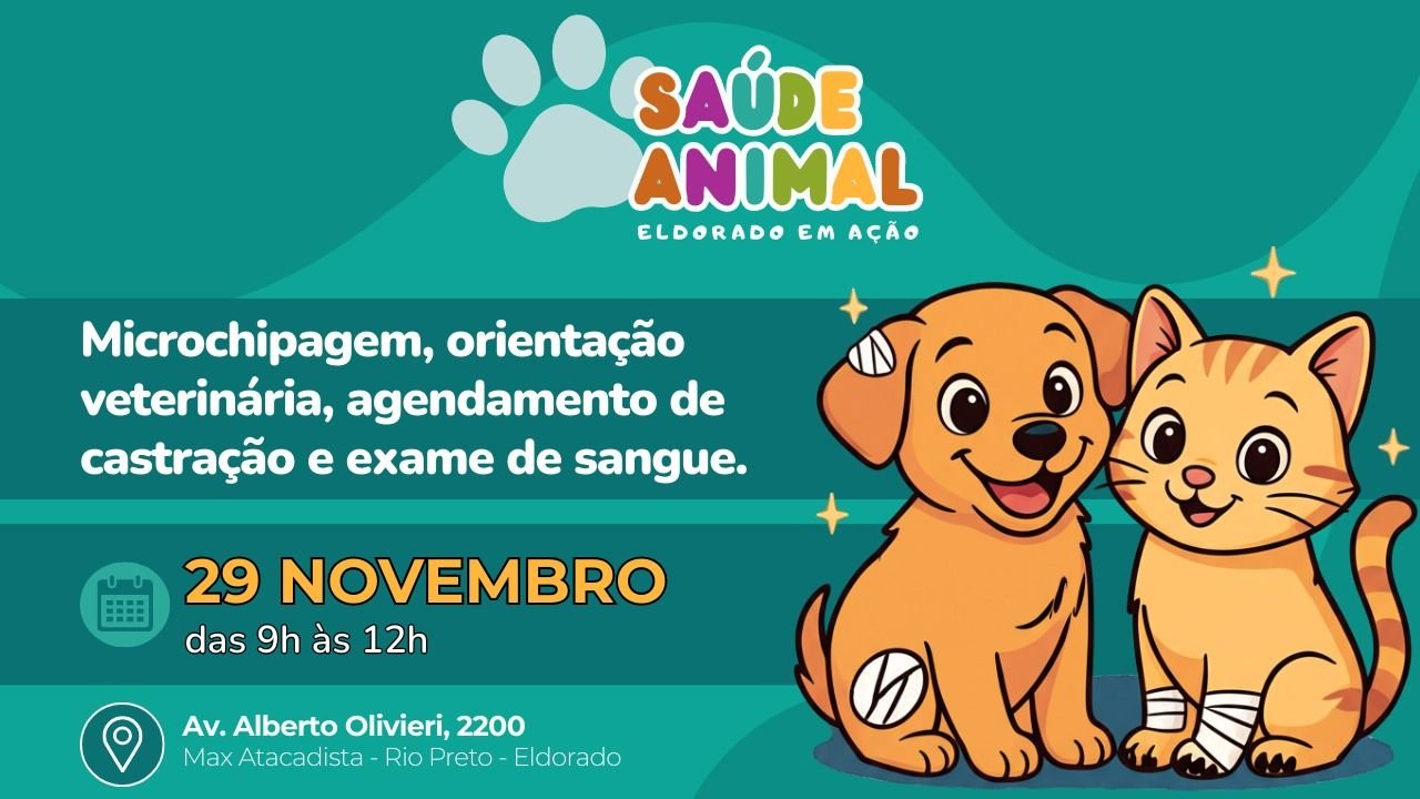 A Secretaria do Bem-Estar Animal de Rio Preto realiza, neste sábado, 29 de novembro, das 9h às 12h, o Saúde Animal – Eldorado em Ação, iniciativa voltada à saúde e ao bem-estar dos pets. O evento acontece no Max Atacadista e oferece microchipagem e agendamento de castração para cães e gatos de munícipes, além de orientação veterinária e exame de sangue. Tudo de forma gratuita.