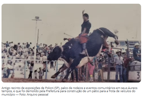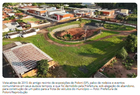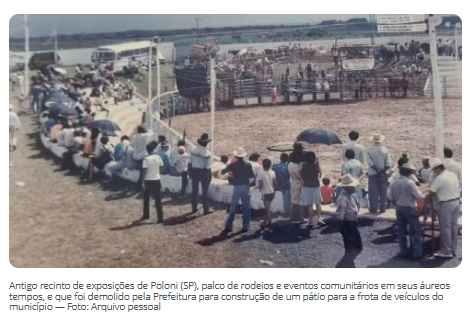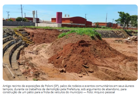 Palco de rodeios memoráveis, festas e eventos comunitários ao longo de 40 anos, o recinto de exposições de Poloni (SP) foi demolido para dar lugar a um pátio para os veículos da frota da prefeitura.