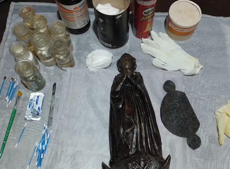 Após a remoção das repinturas com solventes, o restaurador conta que conseguiu identificar algumas curiosidades, como o uso de “cirex” (uma massa de modelar antiga à base de carbonato de cálcio e cera de abelha) para a modelagem mais fina de elementos delicados como a cabeça da imagem e o anjo que se encontra na base da mesma.