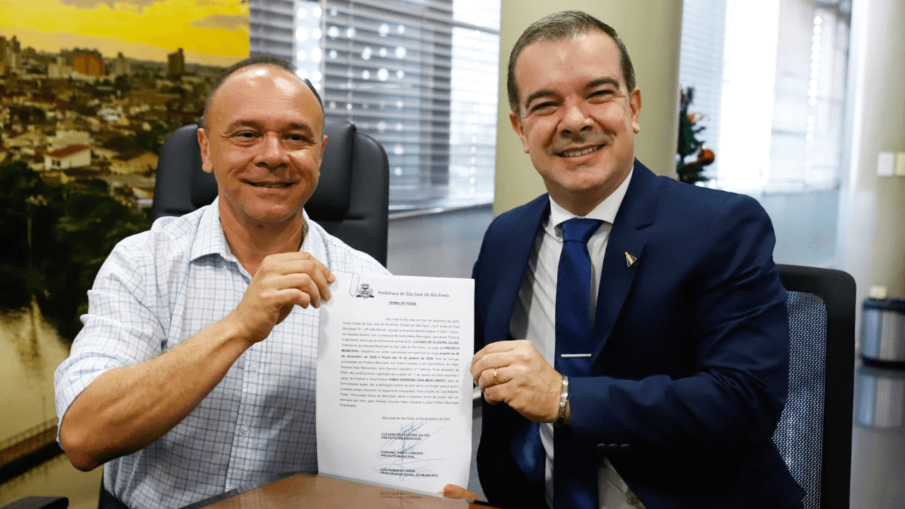 O prefeito de São José do Rio Preto, Coronel Fábio Candido, transferiu temporariamente o cargo ao presidente da Câmara Municipal, Luciano de Oliveira Julião (PL), em cerimônia realizada nesta terça-feira (23), no gabinete.