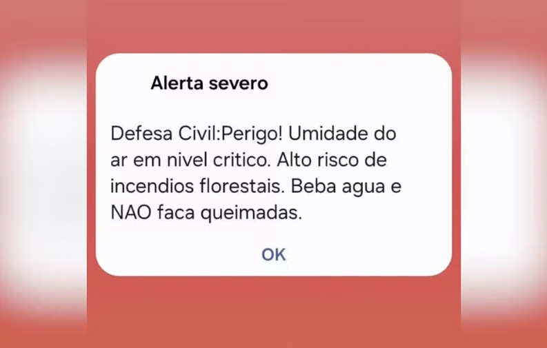 A Defesa Civil do Estado de São Paulo emitiu por volta das 12h30 desta quinta-feira, dia 11 de setembro, um alerta sonoro devido à baixa umidade do ar em cidades do interior paulista. O aviso chegou através da notificação nos celulares, reforçando também o alto risco de incêndio florestais.