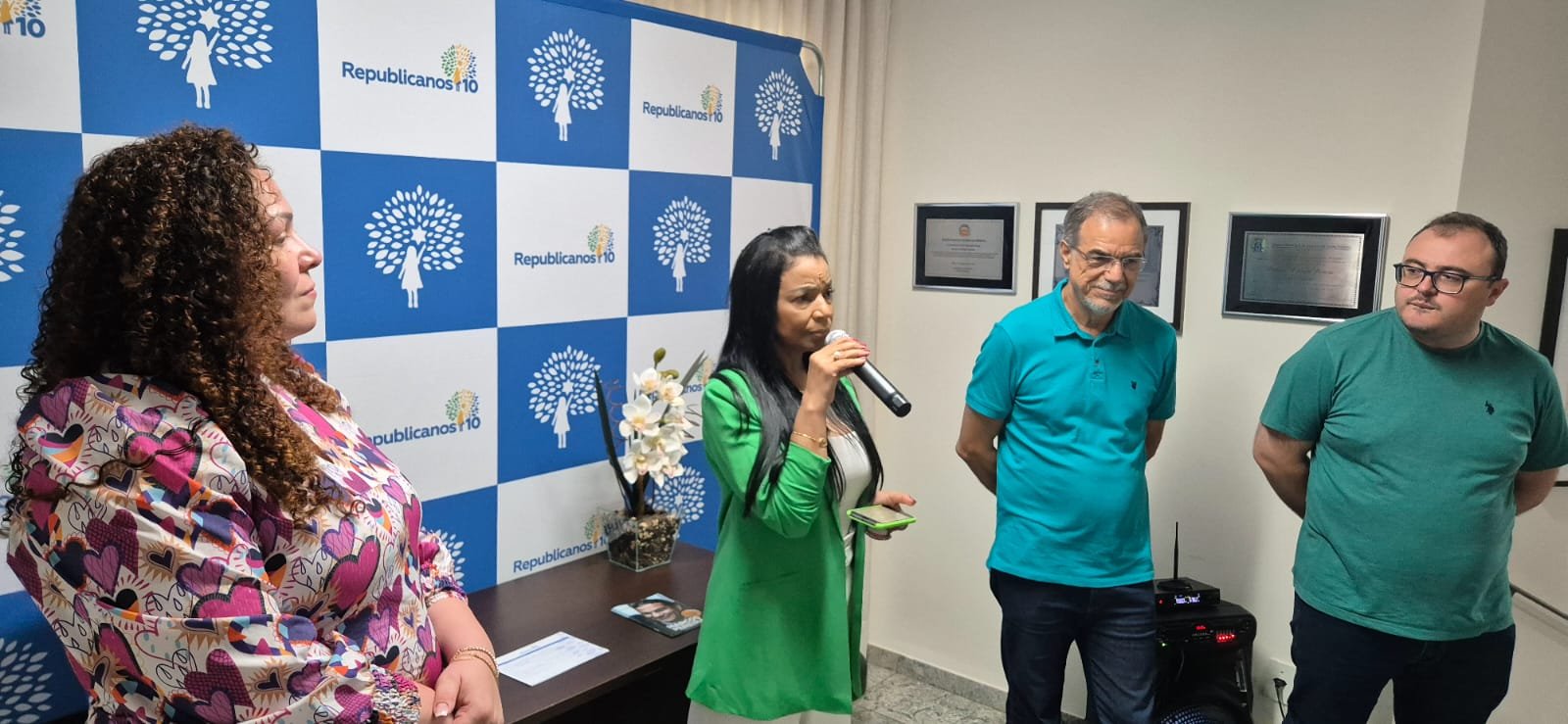 A solenidade contou com as presenças do vereador Pedro Roberto, do diretor regional do Republicanos, Cleber Tavares, da secretária da Mulher, Suelen Tavares e do presidente municipal da legenda, Diego Polachini.
