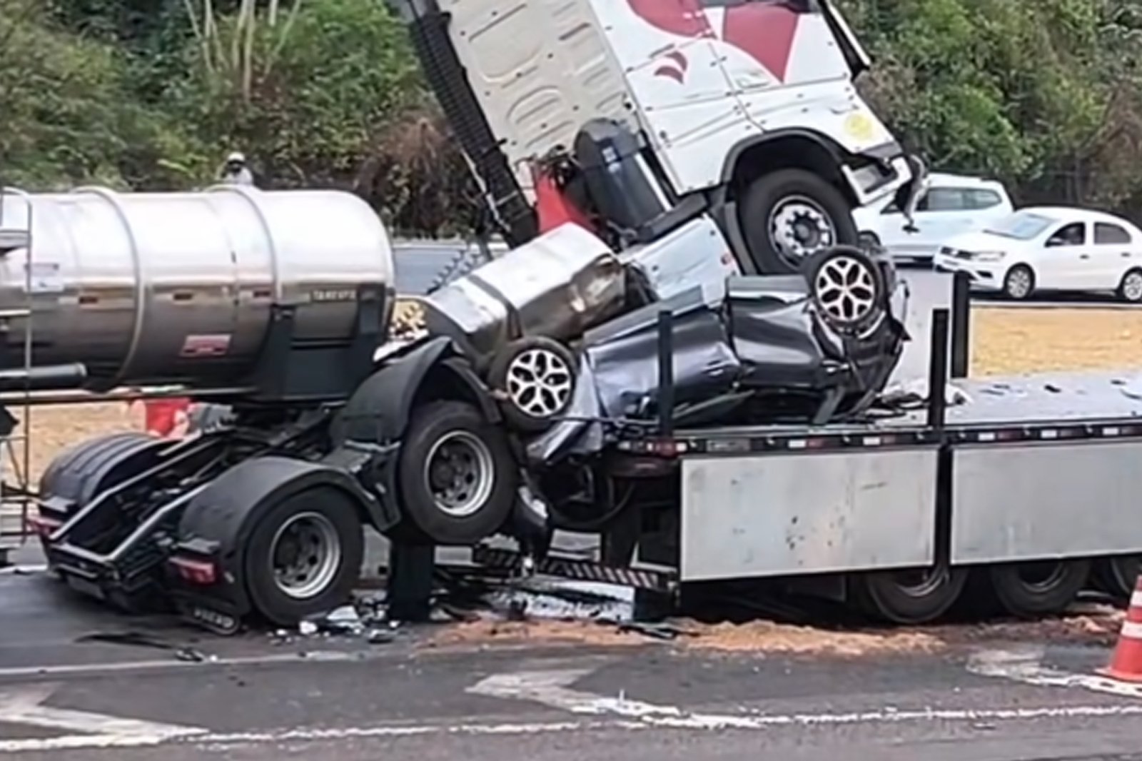 De acordo com a concessionária Eco Noroeste, que administra o trecho urbano, o local passa por obras de duplicação e o trânsito estava lento no momento da colisão. À policia, o motorista da carreta Volvo disse que o sistema de frenagem falhou, fazendo com que o Renaul/Captur fosse prensado em outro caminhão.