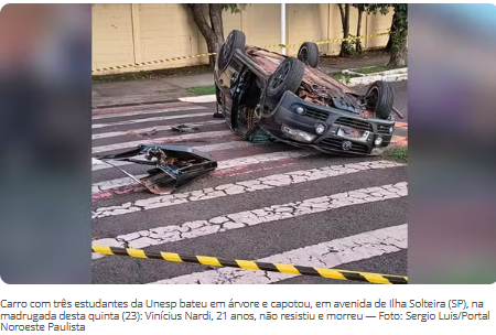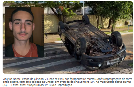 O estudante Vinicius Nardi Pessoa de Oliveira, de 21 anos, de Dracena, morreu após um carro capotar com outras pessoas, na Avenida Brasil, na zona sul de Ilha Solteira, na madrugada desta quinta-feira (23). Os ocupantes tinham ingerido bebida alcoólica, segundo a Polícia Civil.