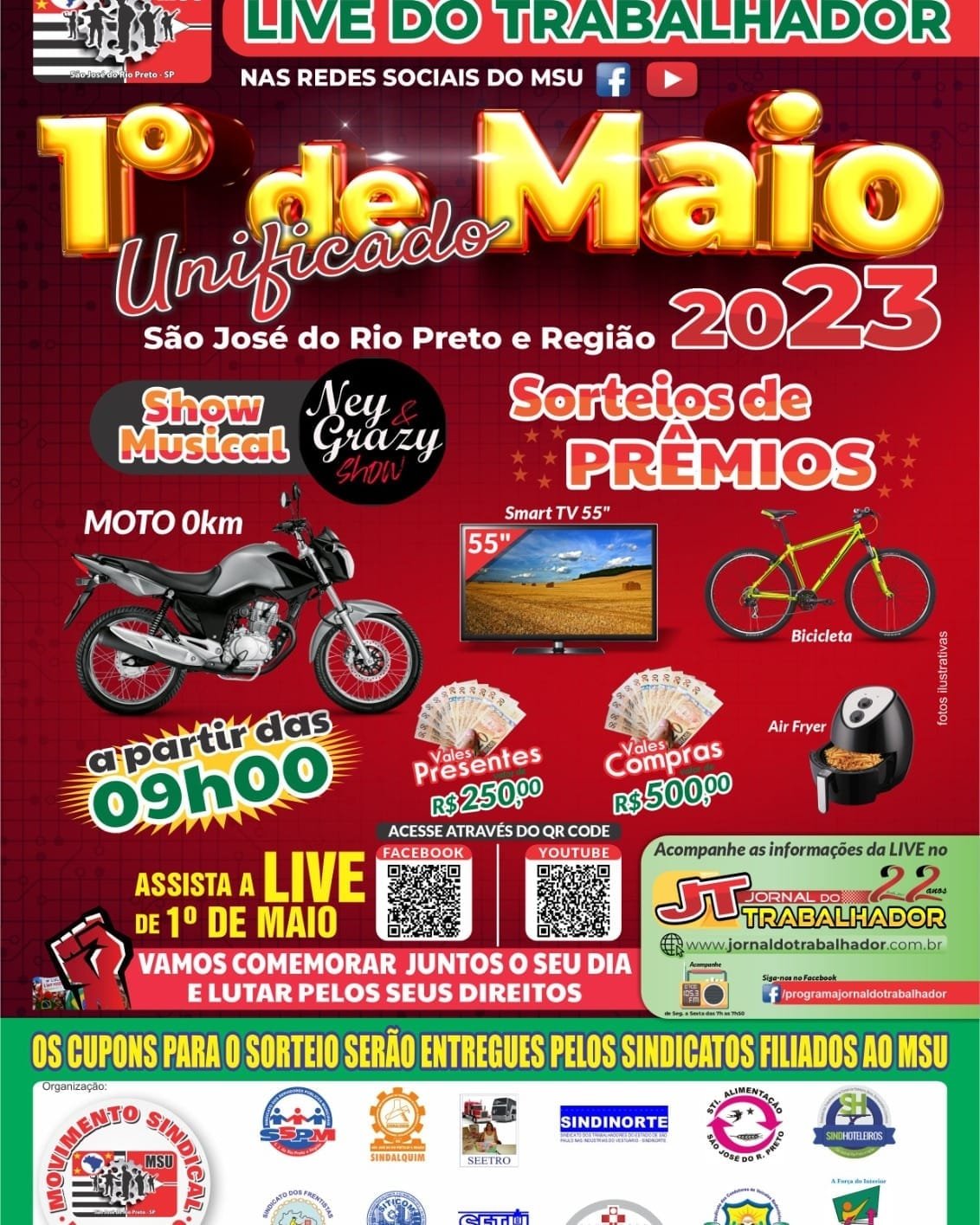 O Movimento Sindical Unificado (MSU) de São José do Rio Preto promove na próxima segunda-feira, dia 1º de maio, a grande Live do Trabalhador, com sorteio de diversos prêmios, apresentações musicais e outras atrações, retomando as festividades do dia 1º de Maio Unificado, em comemoração ao Dia dos Trabalhadores, após três anos de pandemia.