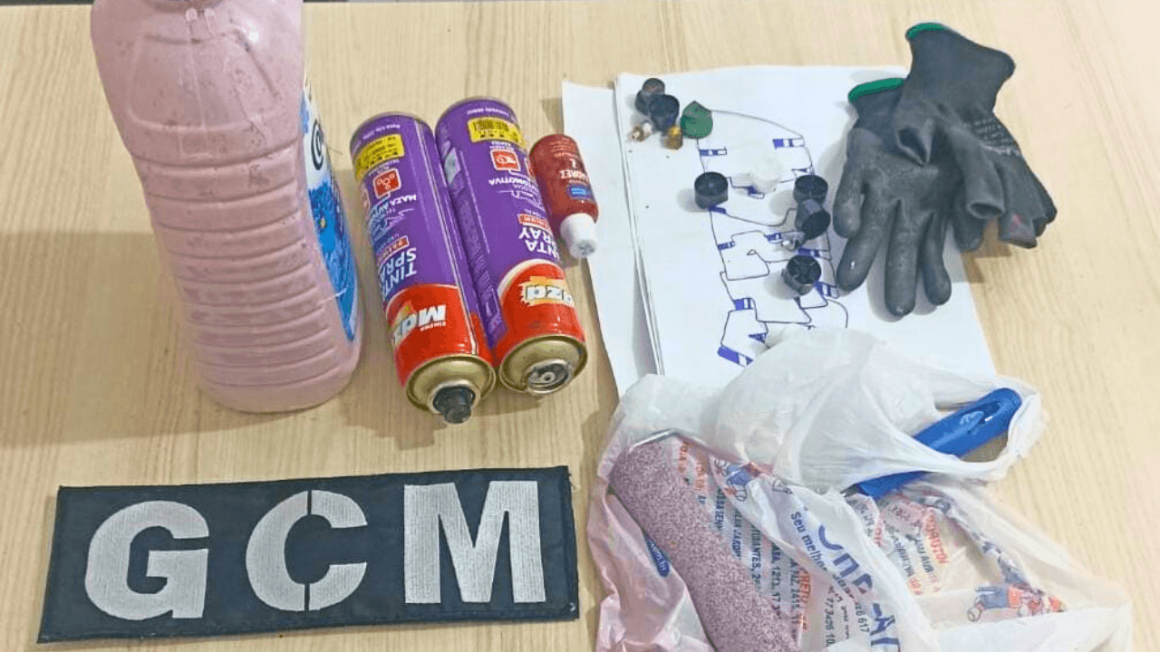 Com ele, os guardas encontraram uma sacola contendo materiais de pintura: um vasilhame de amaciante com tinta lilás, um spray de tinta preta, um corante vermelho, um rolo de pintura com resquícios de tinta lilás, além de luvas, bicos de spray e folhas com desenhos.