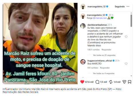 Com mais de 247 mil seguidores no TikTok e 234 mil no Instagram, Marcão é conhecido por publicar vídeos de análises sobre o Corinthians e futebol. O influenciador foi socorrido com uma hemorragia na cabeça, fraturas no fêmur e no rosto.