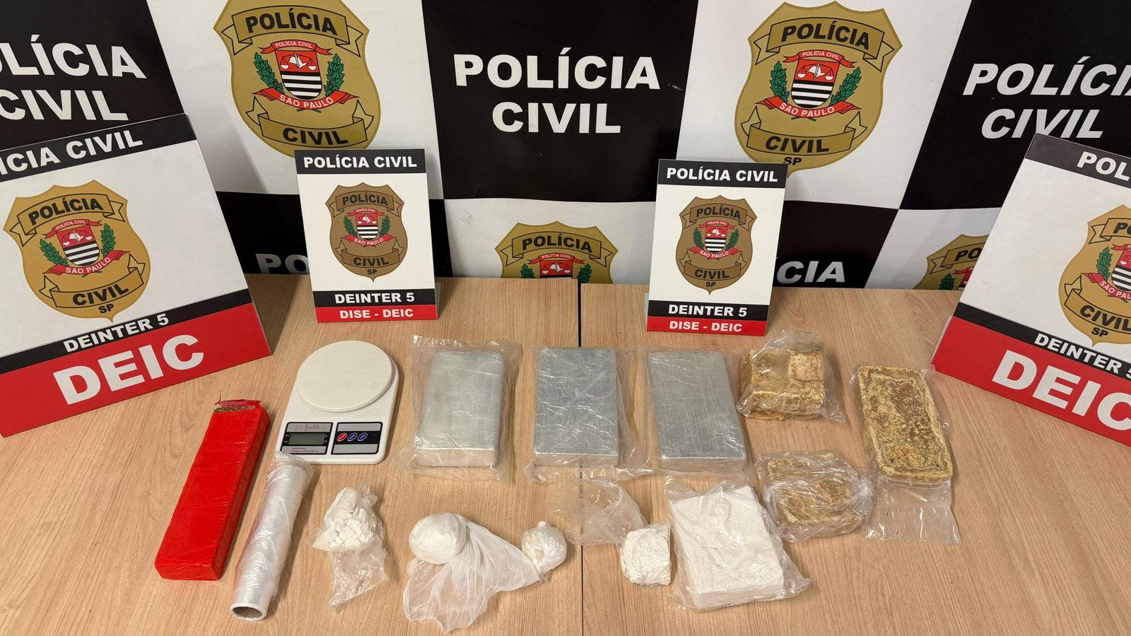 Posteriormente, os investigadores se deslocaram até a residência da autuada no Jardim Arroyo, onde foram apreendidas expressivas quantidades de cocaína, crack e maconha, além de balança de precisão, materiais utilizados para embalagem dos entorpecentes e um aparelho celular.