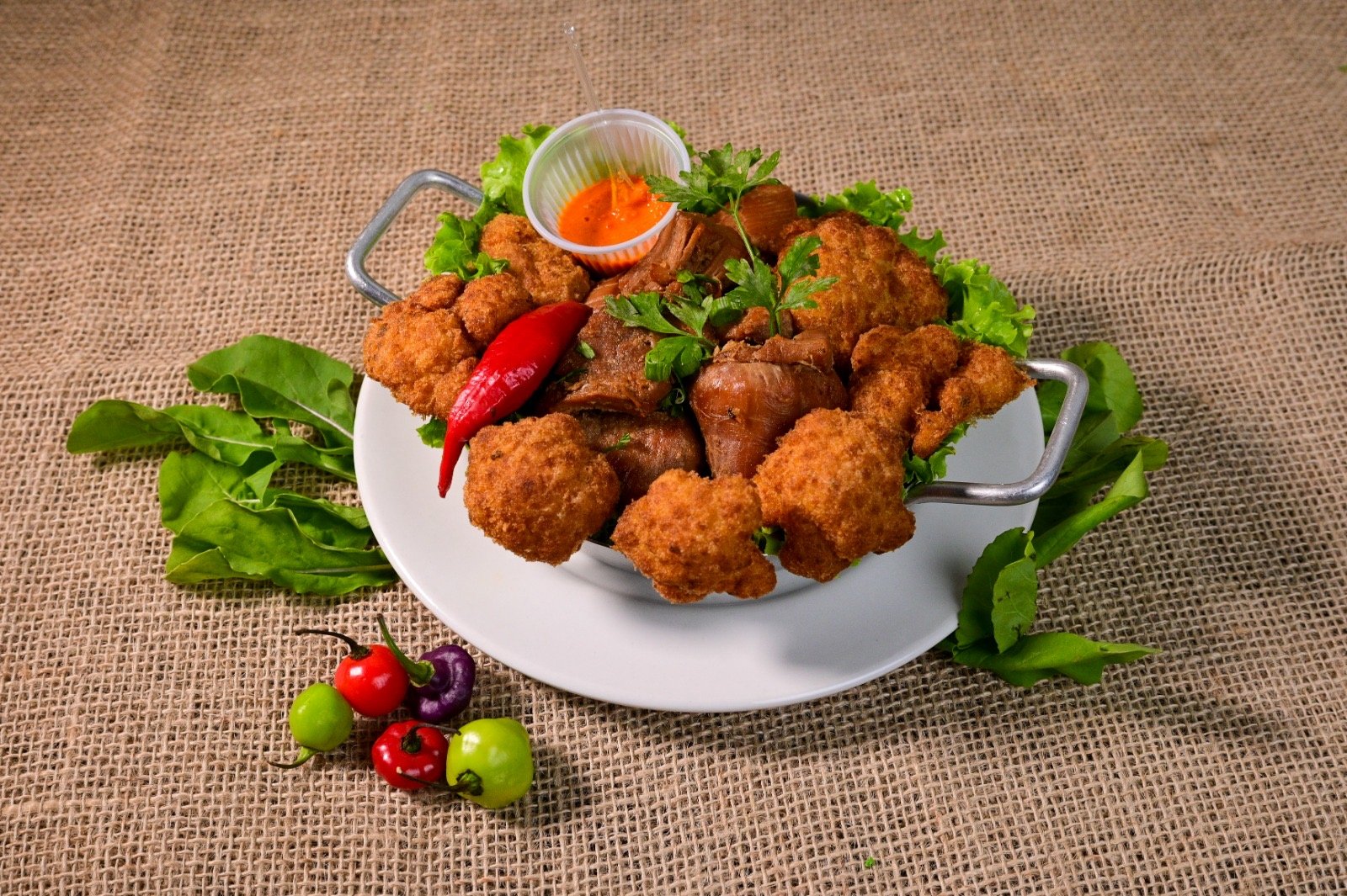 (Carne de porco na lata acompanhada de tempura de verduras e legumes)