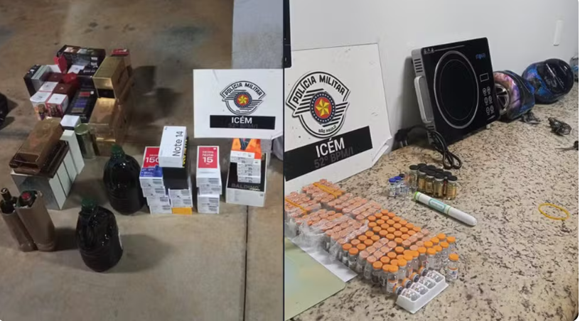Durante revista, os policiais encontraram frascos de tirzepatida (medicamento para emagrecer) no bolso de um dos ocupantes do carro.