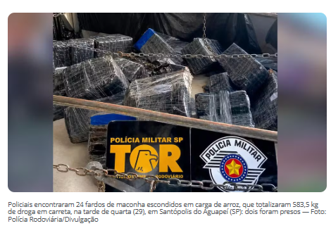 Durante a vistoria no semirreboque, os policiais encontraram 24 fardos de maconha escondidos em meio a uma carga de arroz a granel. Ao todo, foram localizados 720 tabletes da droga, que somaram 583,5 quilos.