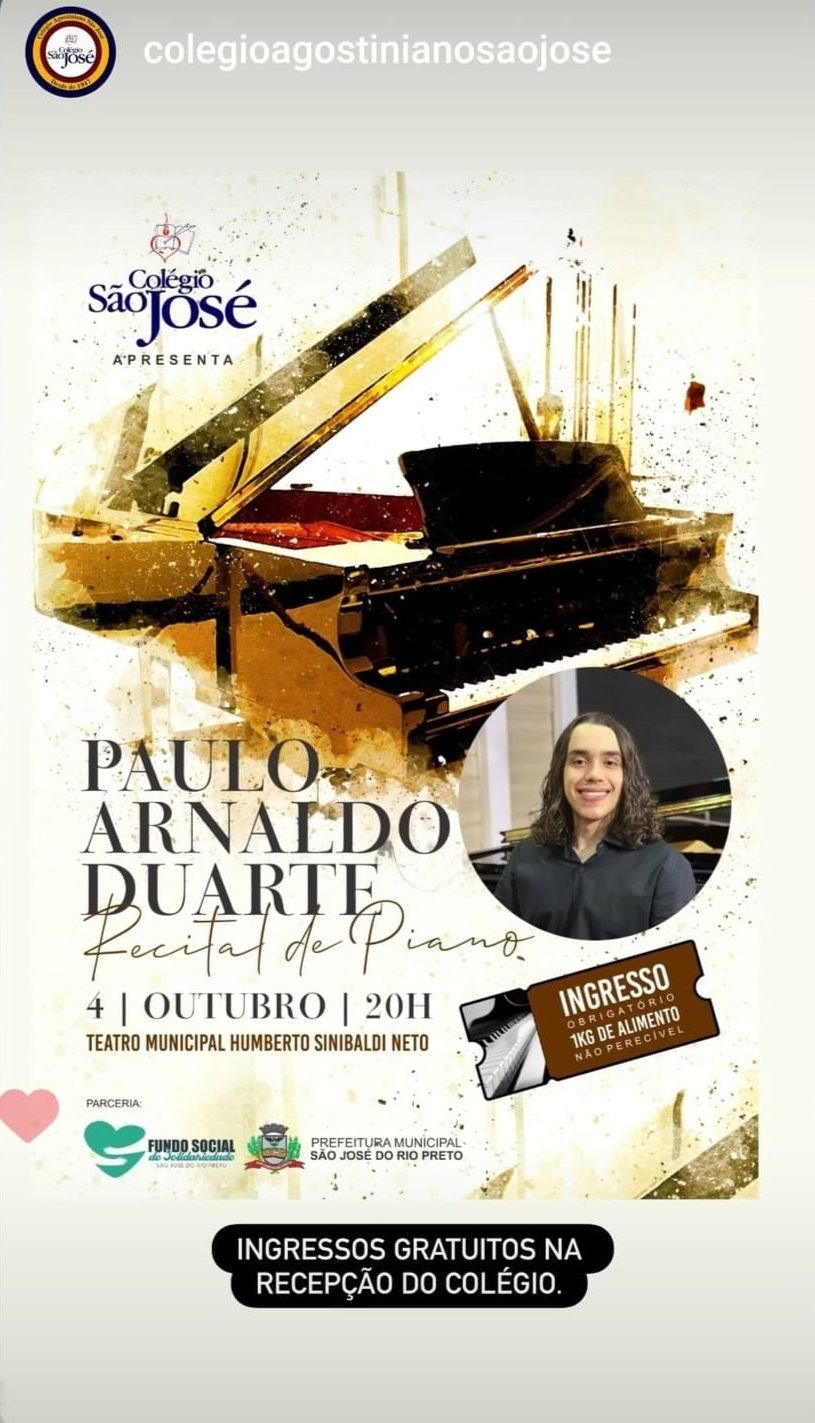 O jovem músico rio-pretense Paulo Arnaldo Duarte se apresenta no próximo sábado, dia 4 de outubro, às 20h, no Teatro Municipal “Humberto Sinibaldi Neto”, em um emocionante Recital de Piano. O endereço é avenida Brigadeiro Faria Lima, 5381 – Vila São José.