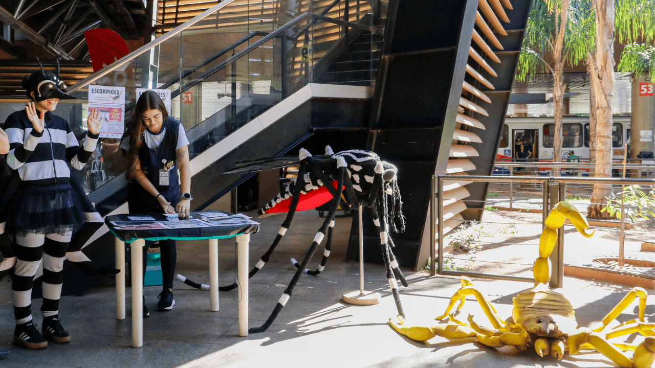 No Terminal, a equipe da Vigilância Ambiental montou uma bancada expositiva com larvas do Aedes aegypti, mock-ups e uma tenda com escorpiões vivos, reforçando não apenas a importância da prevenção ao mosquito, mas também os cuidados necessários para evitar acidentes com escorpiões.