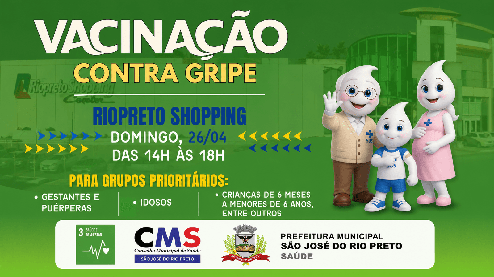 A Prefeitura de Rio Preto, por meio da Secretaria de Saúde, realiza neste domingo, 26, uma ação especial de vacinação contra a gripe no Riopreto Shopping. A imunização será oferecida das 14h às 18h, com foco nos grupos prioritários definidos pelo Ministério da Saúde.