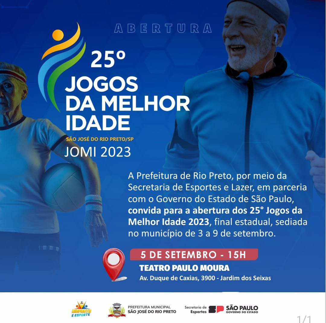 A cerimônia de abertura dos Jogos da Melhor Idade (Jomi), edição de número 25, acontece nesta terça-feira (5), a partir das 15h, no Teatro Paulo Moura, às margens da Represa Municipal, em Rio Preto. O evento terá desfile das delegações, acendimento de pira olímpica, juramento dos atletas, presença de autoridades, além das apresentações da coreografia, com 16 equipes, logo após a solenidade.