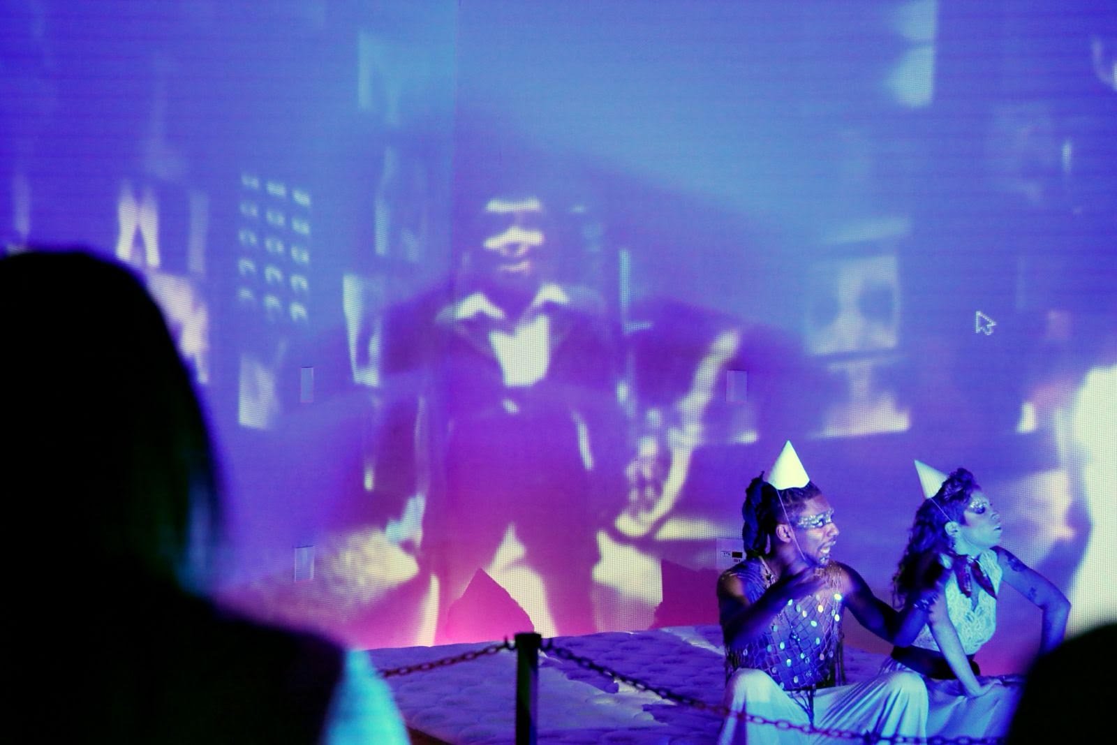 Em ØDISSE.IA, a tecnologia assume um papel central, com o uso de projeções e mapeamento de vídeo, inserindo uma dimensão digital à cena. Essa interação entre tecnologia e performance é uma das marcas do trabalho da companhia, que busca explorar o potencial da tecnologia no teatro sem perder a essência do encontro humano.