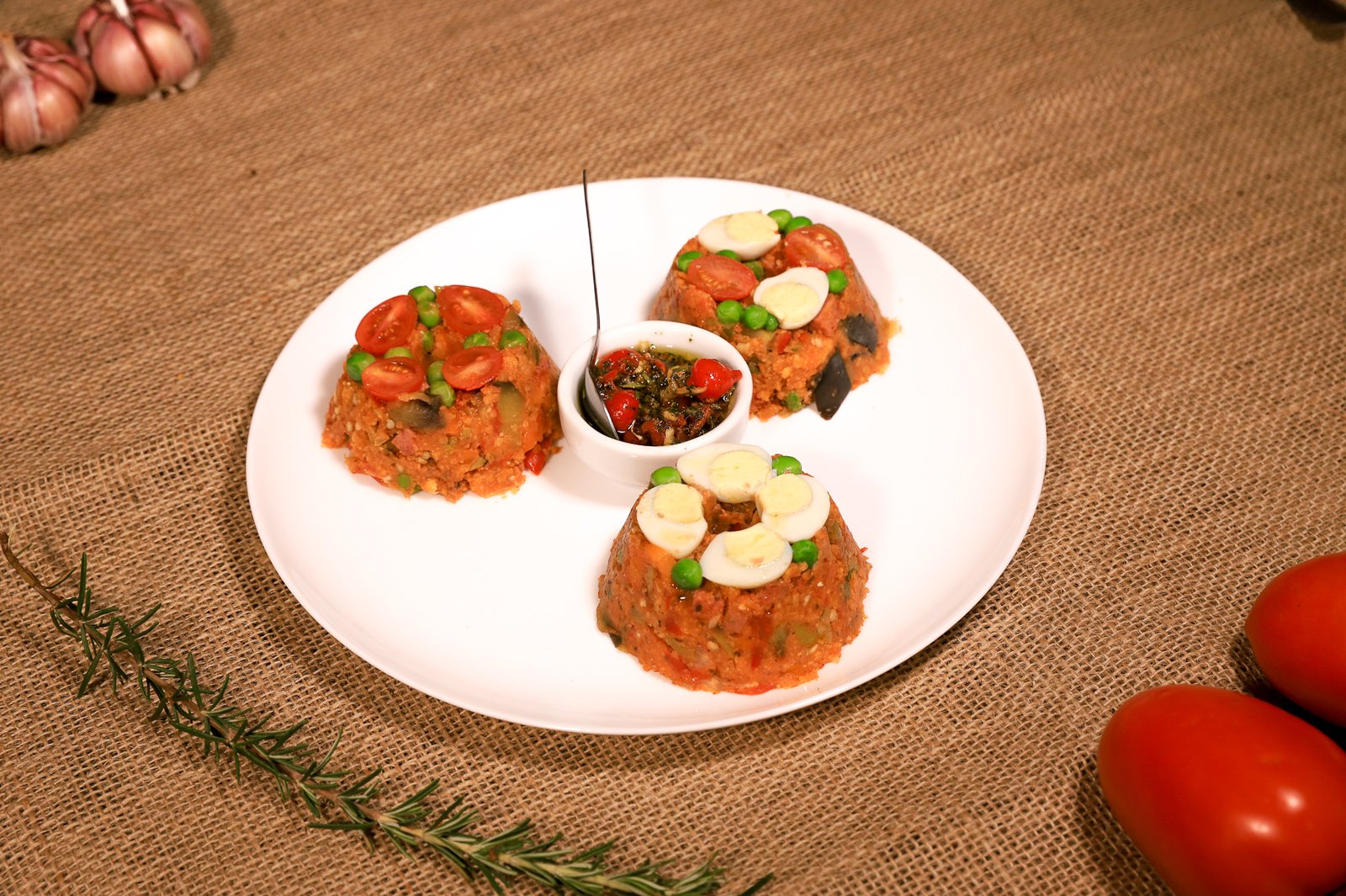 Petisco: Cuscuz da Nice – Cuscuz de berinjela com linguiça calabresa e sardinha, acompanhado de molho vinagrete com pimenta biquinho