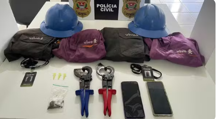 Durante a prisão, os policiais localizaram uniformes com o nome da empresa de telefonia, capacetes de segurança e crachás falsos, que eram usados pelos investigados.
