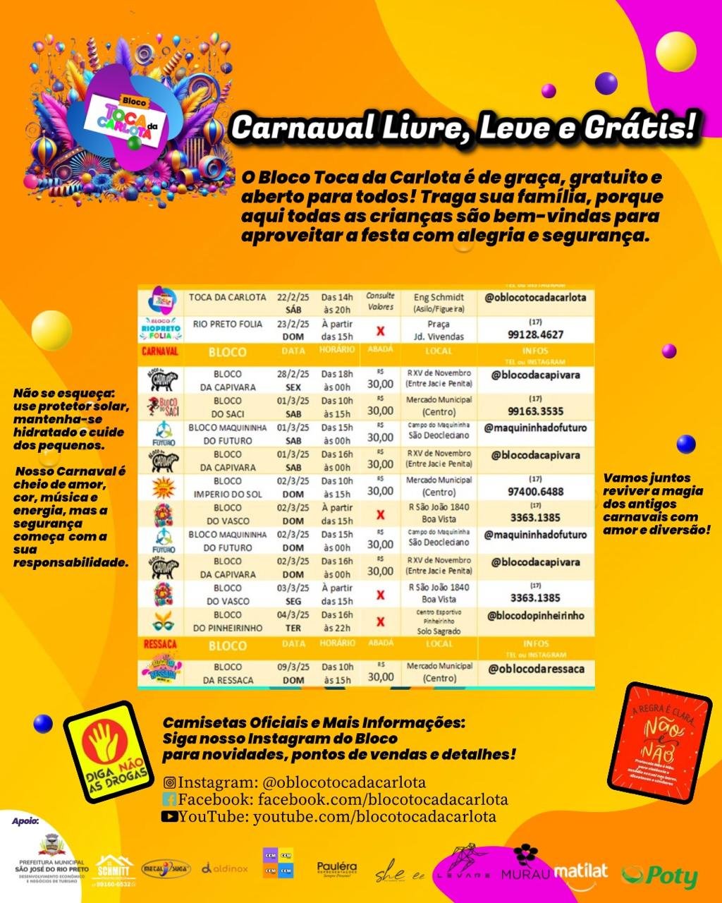 A edição deste ano do Carnaval de Rua de Rio Preto contará com nove blocos, que terão como base vias nos bairros Vivendas, Maquininha, Eldorado, Redentora, entorno do Mercadão e distrito de Engenheiro Schmitt, de acordo com a programação abaixo.